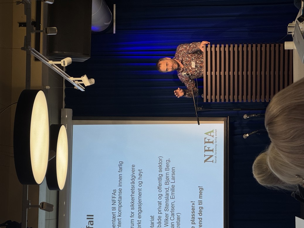 Forrige uke deltok NFFA på Sirk Norges fagsamling, en viktig møteplass for aktører innen sirkulærøkonomi og avfallsbehandling. På vegne av NFFAs Fagforum farlig avfall tok forumleder Torbjørn Steensrud fra Stena Recycling plass på scenen, der han holdt en faglig sterk presentasjon om aktuelle utfordringer og utviklingstrekk innen farlig avfall. I innlegget løftet han frem sentrale bransjespørsmål, blant annet prinsipielle avklaringer med Arbeidstilsynet om diisocyanater og asbestavvik på gjenbruksstasjoner, avklaringer som bidrar til at bransjen unngår behovet for spesialiserte kurs på et stort antall kjemikalier. Steensrud presenterte også forumets deltakere, oppsummerte temaene vi har hatt til diskusjon, og pekte på kommende initiativer som planleggingen av en studietur for operativt personell. Han oppfordret samtidig til innspill og forslag til nye deltakere i forumet.
