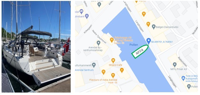 Båten vår (en Bavaria 46) ligger langs brygga i Pollen hele uka (nærmest gangbrua). Se etter Berngaard/NFFA-banner og flagg. Vi gleder oss til å treffe våre forbindelser når dere rusler rundt i Arendal.