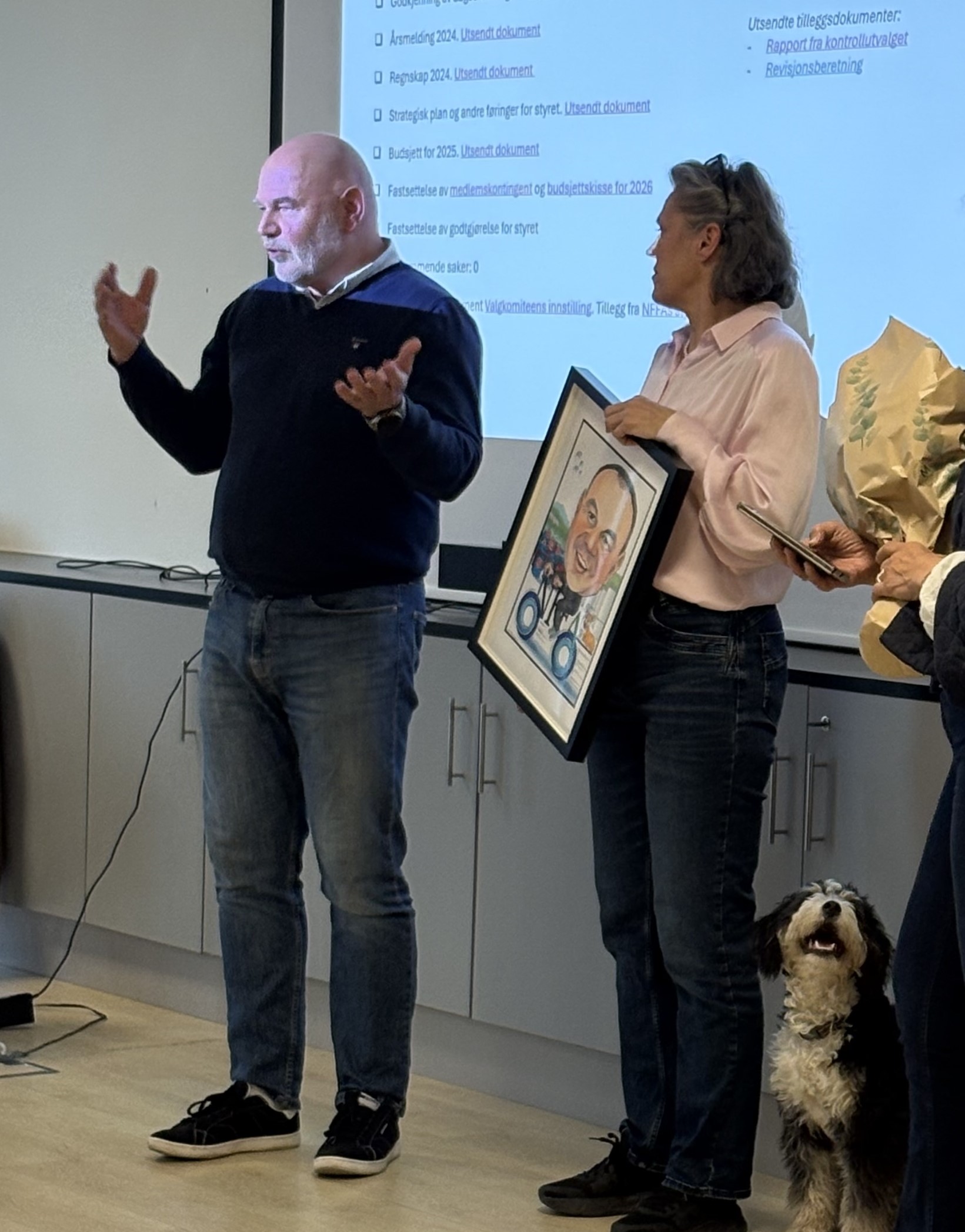 Foto: Avtroppende styreleder, Bjørn Roger Broen, takkes for en betydelig innsats for NFFA gjennom en lang rekke år. Foruten mange rosende ord for sin innsats, ble han overrakt både blomster og en karrikaturtegning av ham selv, selvsagt sammen med sin kjære motorsykkel. Overrekkelsen sto NFFAs generalsekretær, Randi Pedersen, for.