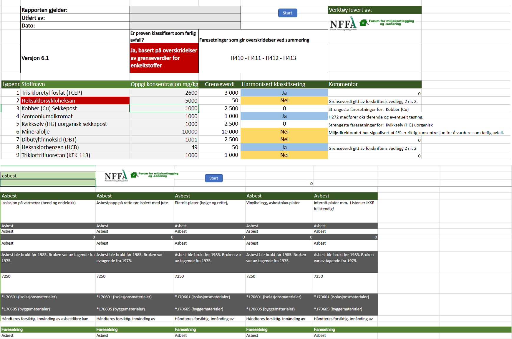 Eksempel fra klassifiseringsverktøyet "Hva gjør avfall farlig?" i Microsoft Excel